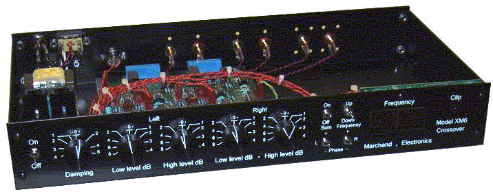 SPECIFICATIONS Frequency response: 2Hz to 100 KHz, + 0.2 dB/ -3 dB Crossover frequency: 20 Hz - 5 KHz Insertion gain: 0dB ( 1X ) Filterslope: 24 dB/Octave Harmonic distortion: less than 0.01% (at 1 KHz) Signal to Noise ratio: better than 110dB Input impedance: 100K Output load capability: 100 Ohm min Output impedance: 10 Ohm typ Maximum input voltage: 25 V peak-peak (8.8 V RMS) Maximum output voltage: 25 V peak-peak (8.8 V RMS) Power supply requirement:120 VAC, 60Hz, 10W Dimensions: 17"W X 8.5"D X 2.8"H Construction: All metal cabinet, black with white legend FRONT PANEL CONTROLS and READOUTS Level controls: -8dB to +4 dB (4 each) Damping: 4dB to +6 dB at Xover frequ. Phase invert: +/- Low pass: on/off Summing mode: on/off Power switch: on/off Frequency: momentary up/down Frequency readout: 4 digit LCD, 20Hz to 5000Hz Level indicator: on when signal level too high REAR PANEL CONNECTORS Inputs, outputs: RCA phono (6 each), gold plated Remote frequency switch: 3 pin DIN Line power fuse: 1 Amp Power: IEC connector, line cord detached ORDERING INFORMATION XM6-A Crossover network, Fully assembled and tested